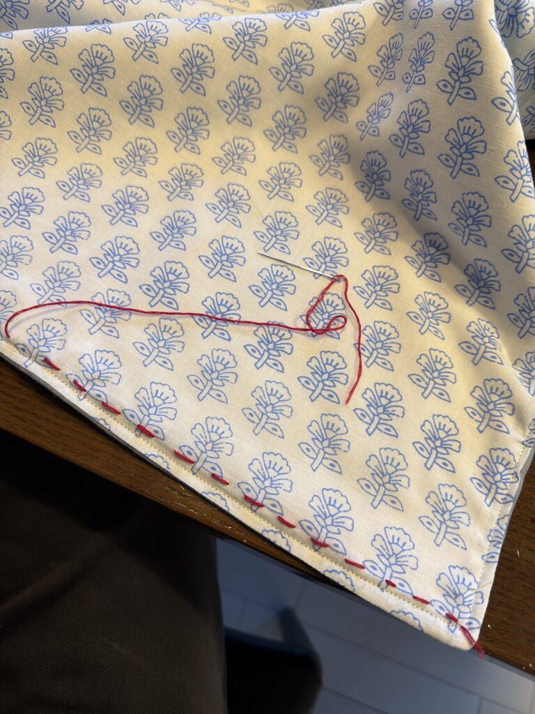 ステッチ幅が0.8cmくらいを目安に、きっちり揃えすぎず、針目も力加減も少しゆるめに。
